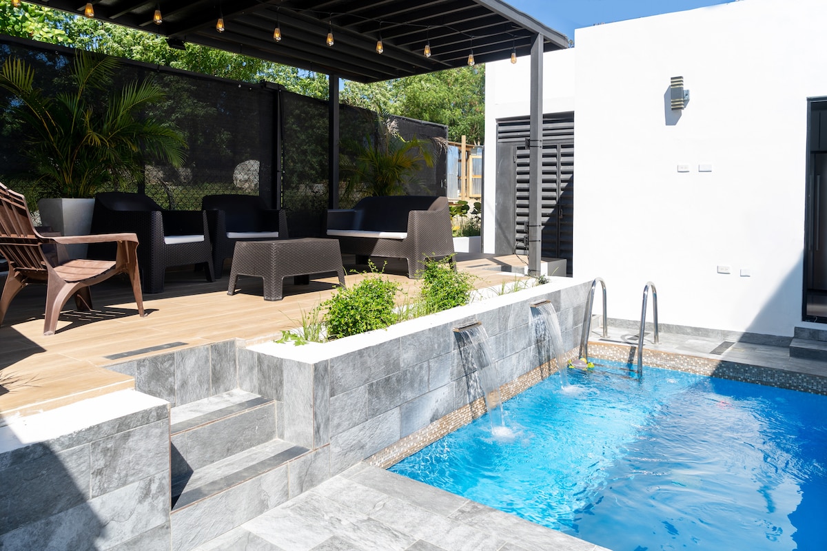 Sunview Villa is the perfect place to retire away from the city and enjoy your deserved vacation relaxing with your friends or family. In our private patio you have a wide space to share; roofed terrace with a 55" TV with Stereo System, BBQ area, patio with table, and our great pool & cascade and hot jacuzzi! 10 minutes away from the airport, 10 minutes away from the city center, and 5 minutes away from Playa Dorada, Our Villa is perfectly located! Chef service available! Events organization!