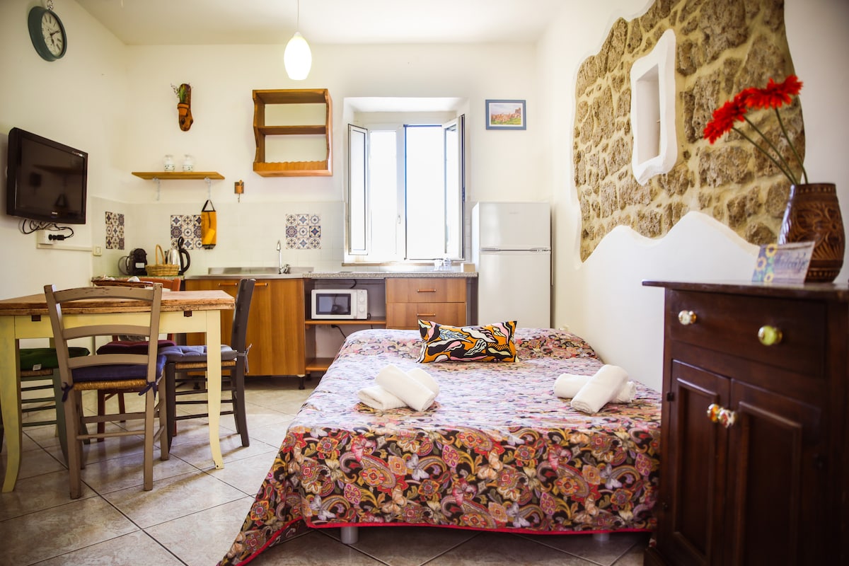 Studio apartment in the heart of Pitigliano, a short walk from the Synagogue and the Etruscan Vie Cave. The apartment offers a beautiful view of the Meleta valley. It is carefully furnished with antique and valuable furniture and objects. It offers a smart working station. The house is located in the center of Pitigliano, just a few meters from the Synagogue and the “Etruscan hollow streets”. It offers an amazing view of the Meleta Valley. The apartment is furnished with care and with fine antiques.