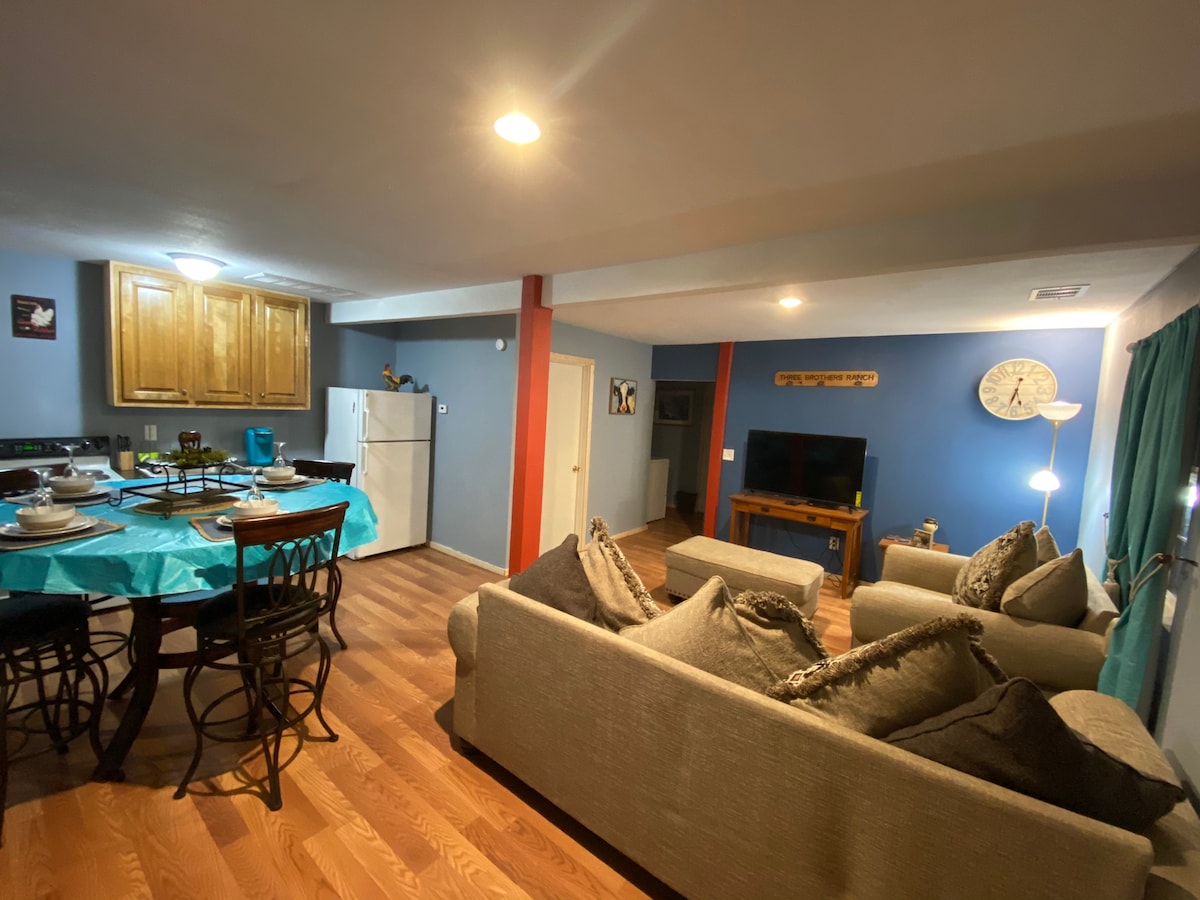 This is a working Texas Longhorn Ranch, this apartment is separate from the house, with entry private. Has a small wet bar, Living area looks out to pasture and has a sleep sofa, small kitchenette, with refrigerator, coffee maker and toaster. Bathroom has shower big enough for two. The ranch has a private gated entry. We are a working ranch so if you inquire and we don'trespond for 6 or 8 hours it is noisy on tractor and around cattle so be patient. Welcome Snow birds and Europeans .