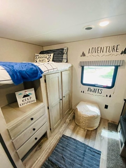I host a 2020 Beautiful Evoke Rv. It has been well taken care of and cleaned and ready for guests. It is located in a quiet rv park in Porter Texas with an on-site laundromat and extra showers and rest rooms for you or your guests’ convenience. It has a king size bed with a sink and mirror in the master and 2 full bunks and a small sofa bed in the living area. There is an electric fireplace for heat or ambiance. There are purple lights throughout and on the porch for your enjoyment.