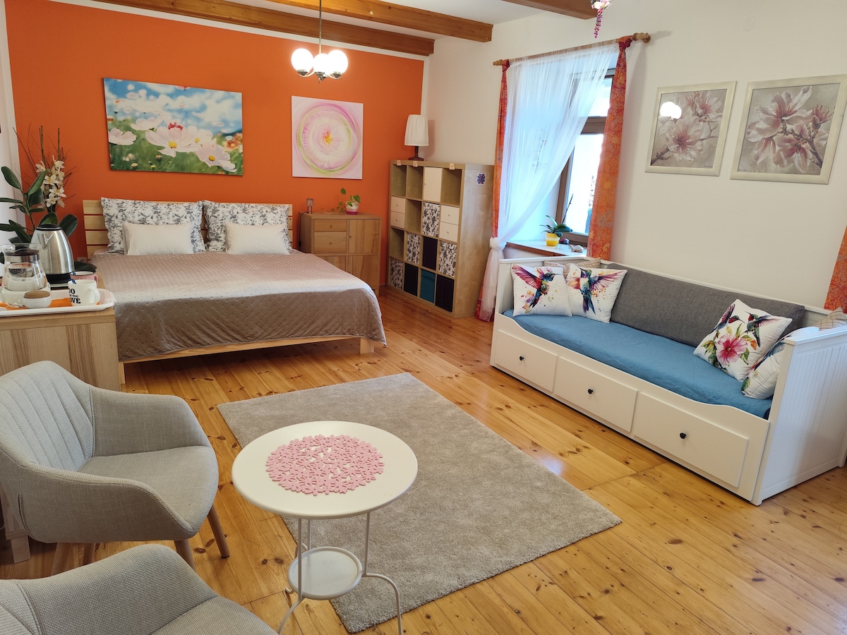 This is a furnished one-room apartment on the ground floor of a family house. With the possibility of outdoor seating. The apartment is located in a historic part of the city. Within walking distance of the information center, the local castle, restaurants and shops. Bus station 300m away, train station 500m away. Public parking 450m away.