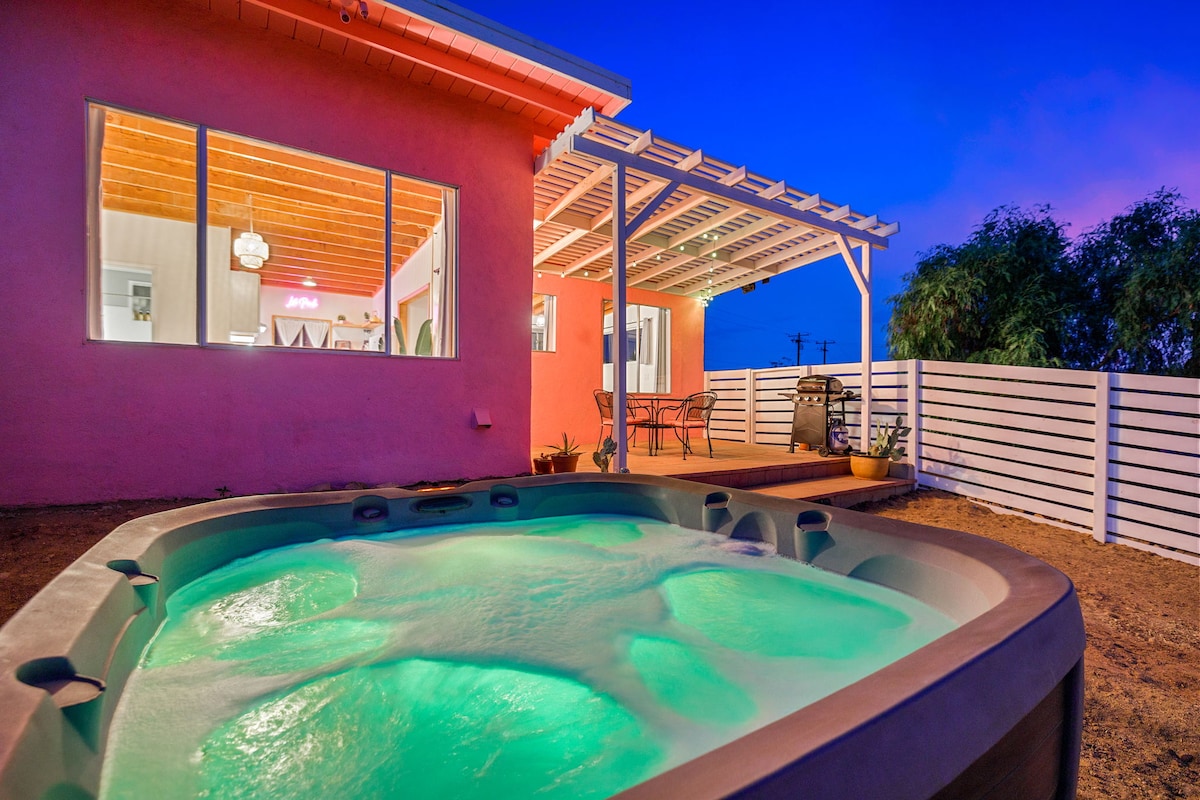 Welcome to your oasis at Lil Pink! When you pull up to the private, 2 acre property, your jaw will drop at the 360 degree mountain views You can find rest & relaxation in the hot tub, steps from the back patio, or in the cowboy tub pool & elevated deck in the middle of the property At night, you can marvel at the thousands of stars above Enjoy quick & easy access to Joshua Tree National Park, Pioneertown, Palm Springs & Yucca Valley What are you waiting for? Come fall in love with Lil Pink!