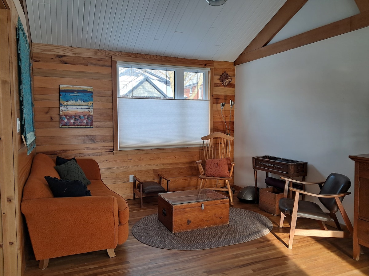 Take it easy at this unique cabin experience in the city. The Tiny House is a private 9’ x 12’, fully insulated, 4 season cabin with a couch, kitchenette with running water, queen bed, Loftnet hammock & outdoor shower. Enjoy the natural beauty of our half acre tree-filled backyard, yet still close to downtown Guelph. This is a glamping experience that requires appreciation for tiny house living. Guests have access to a separate portable washroom, by walking about 100ft to the back of the yard.