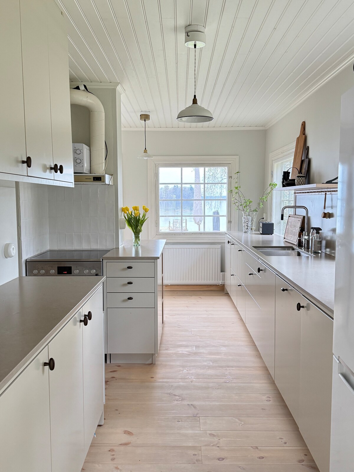 A modern villa with a lake plot, large private dock, hot tub and sauna. Fantastic views of Lake Boren where the canal boats pass by. Just as cozy in summer as in other seasons. Good fishing in the lake. Basement house where the upper floor has an integrated kitchen and living room for socializing with panoramic lake view and toilet. The lower floor has three bedrooms, a bathroom, laundry room and living room/TV room. On the property, there are also two smaller cottages with a guest room in each, bathroom (not winter time) and sauna.