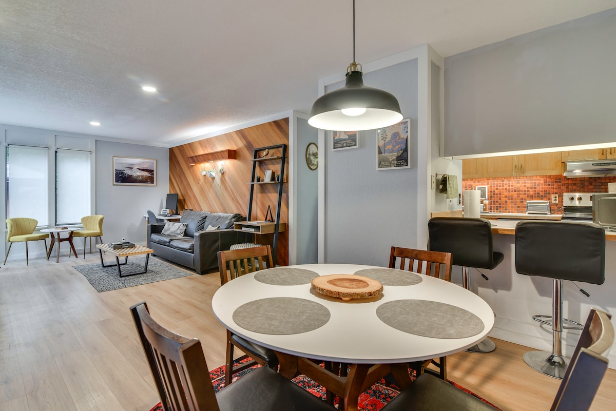 This one bedroom condo has modern touches and an open floor plan. The unit has been completely updated and is perfect for any getaway to Mt Hood. The Living room has a nice sofa with chase, WiiU and a large OLED 4k TV. There are plenty of hooks and a boot dryer for all your wet gear. The bedroom has a dedicated work area, King bed, and plenty of space for all your clothes. The kitchen is stocked with everything you need to prepare a meal and has seating for 6. The Fridge is Epic.