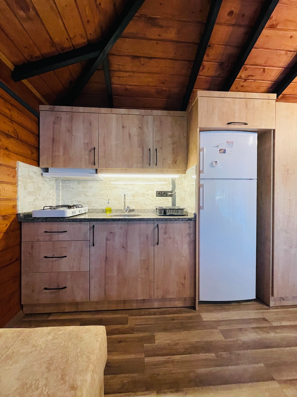 Detached, balcony, panoramic glass, 30 square meters of interior space, large ceiling, wooden, insulated, handmade, 70 cm above the ground, toilet with shower, mini fridge, sea view bungalow. On the driveway, with free parking, 150 meters above sea level, a total of 2000 square meters of magnificent sea view, designed in amphitheater style, 15 minutes walk to Kabak Beach. You can do your shopping and use the shared kitchen, there is a fridge, oven, stove and other kitchen utensils.