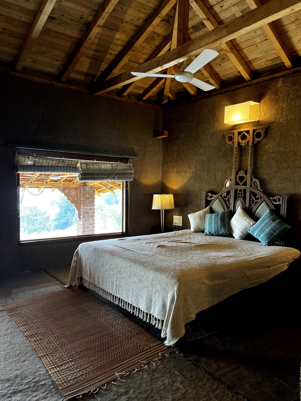 This luxurious suite cottage (one of 2 suite cottages on the property) has the most direct view of the Mulshi lake is built from natural mud and laterite stone. The mulshi lake is visible through the large glass window directly opposite the vintage wooden bed. The cottage is located away from our common areas at a 2-3 minute walk & includes navigating steps along an incline. Our property is spread over 2 acres of greenery, native trees, orchards & farms in the Sahyadris between Mumbai & Pune.