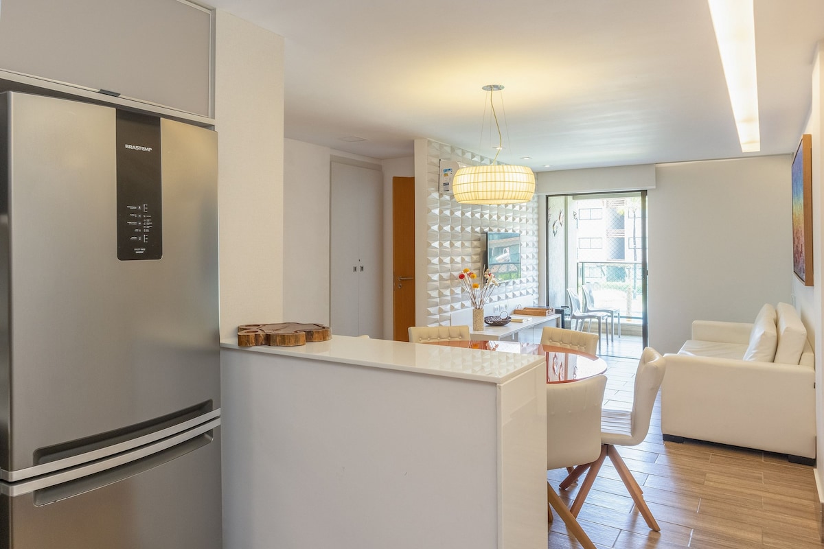 Premium 3-bedroom flat in the Cupe Beach Living Condominium, one of the best in the region, on the seafront, with 24-hour reception, adult and children's pools, courts, fitness center, game room, playroom, cinema, restaurant, convenience store, beach chairs and umbrellas. Sleeps up to 8 people plus 1 child under 12 years old. Air-conditioned bedrooms, suite with minibar, living room with Smartv and sofa bed, Wi-Fi, full kitchen, gourmet balcony with gas barbecue and pool views.