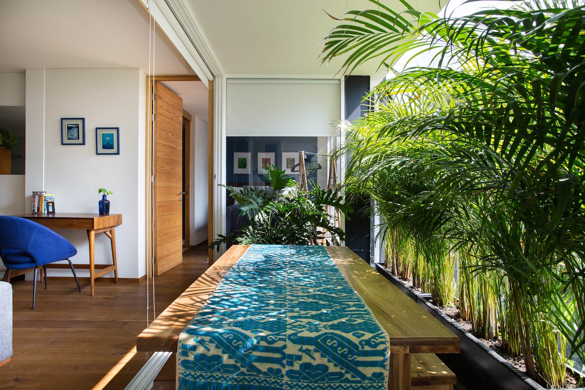 Push open folding big doors first thing in the morning and step onto a green patio for a blast of fresh air and daylight. The big floor to ceiling doors keeps the apt ventilated and fresh. High ceilings with clay and wood beams, bunch of light, and artesanal tiles and wood floor. The place is silent, carefully decorated, very nice for work or just to be here. This new one: https://www.airbnb.mx/rooms/1604605046335668118?guests=1&adults=1&s=67&unique_share_id=4dd1b1c9-fc93-4c94-9ca1-c91cd0256dae