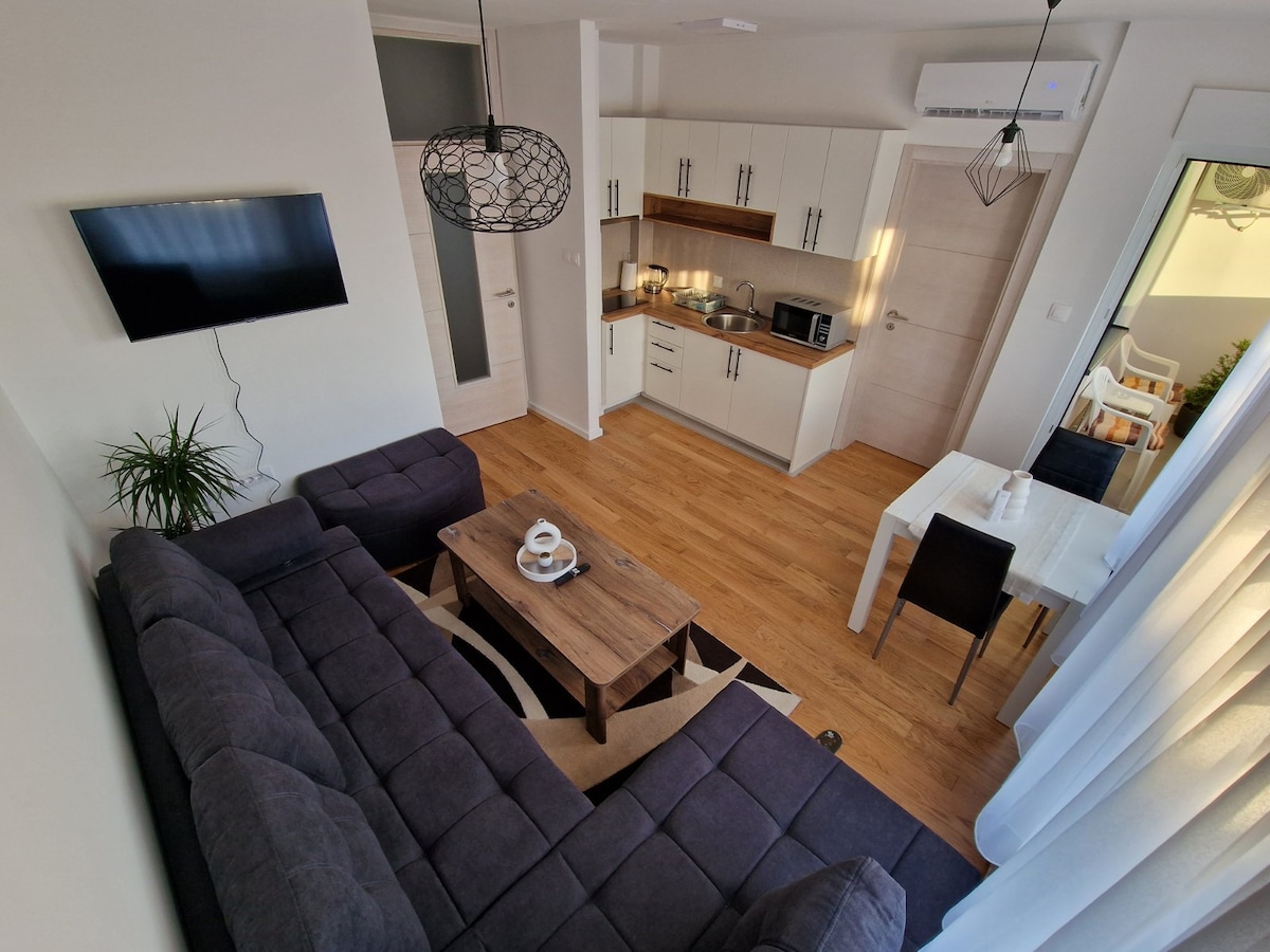 Dobrodošli u naš novi, vrlo udoban studio apartman od 33m2 u novoj zgradi sa balkonom, uređen je za 2 osobe i ima bračni krevet. Besplatni su: stabilan wi-fi, Android TV32", gradsko centralno grijanje, A/C, privatno parkirno mjesto u garaži u zgradi. Apartman se nalazi u novom naselju u četvrti Ferenščica, samo 4 km od centra grada i samo 2 km od Glavnog autobusnog kolodvora. Konzum market i Bipa drogerija udaljeni su 100 metara. Tramvajska stanica udaljena je 5 minuta hoda.