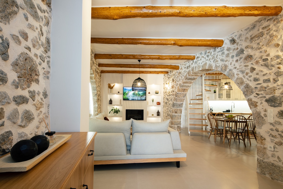 A beautiful guesthouse for two people, within walking distance to one of the most beautiful beaches on the south coast of Crete. This guesthouse consists of two floors connected by a beautiful wooden spiral staircase. The ground floor has a nice living room with a fully equipped kitchen, kitchen bar, sofa (able to be converted into a full double bed), and a dining table. The upper floor has a large bamboo bed (1.60m), balcony, and bathroom.