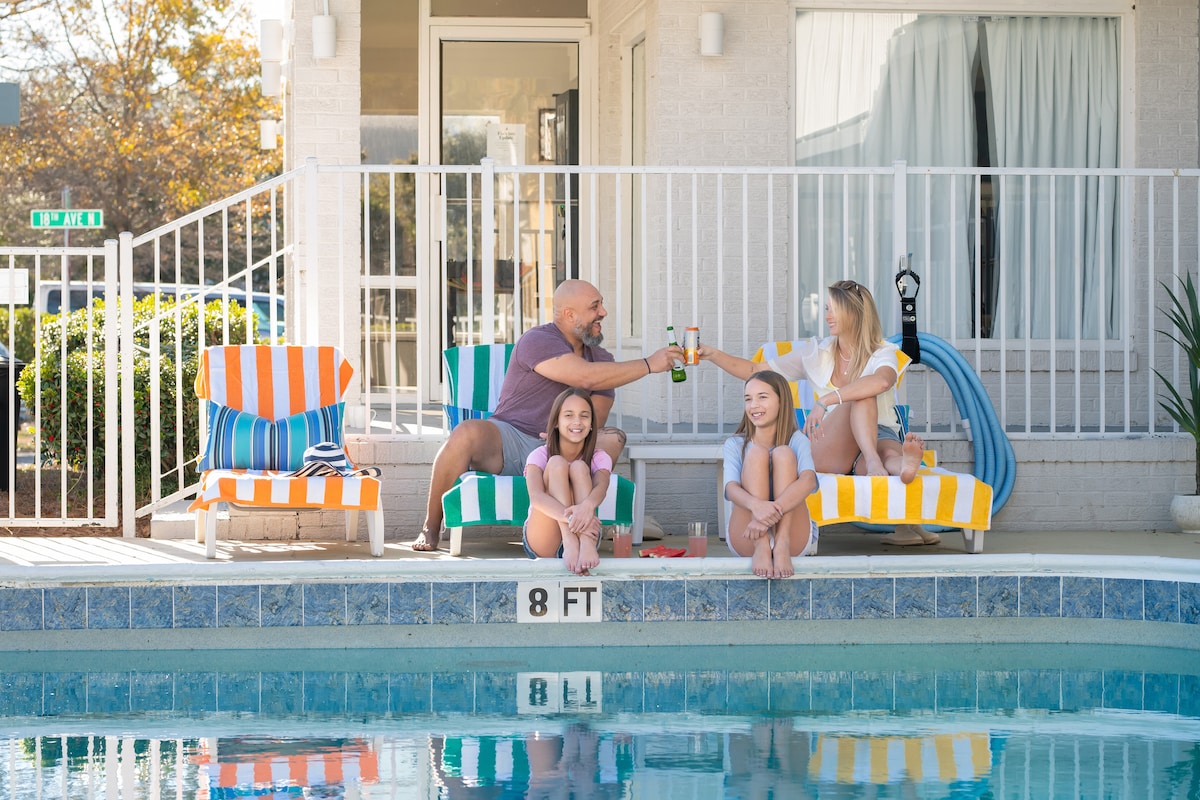 Just steps from the sand, our refreshed Fin’s Inn & Suites studio is perfect for a romantic beach escape. Designed for two, this bright retreat features upgraded beddings, AC, a mini fridge, microwave, and fast Wi-Fi. Enjoy free parking, take a dip in the sparkling pool, relax in the game lounge, and stroll just 3 minutes to the beach or 10 minutes to the lively Boardwalk. Fin’s Inn & Suites also offers several room layouts in the same building—visit our host profile to explore other options.