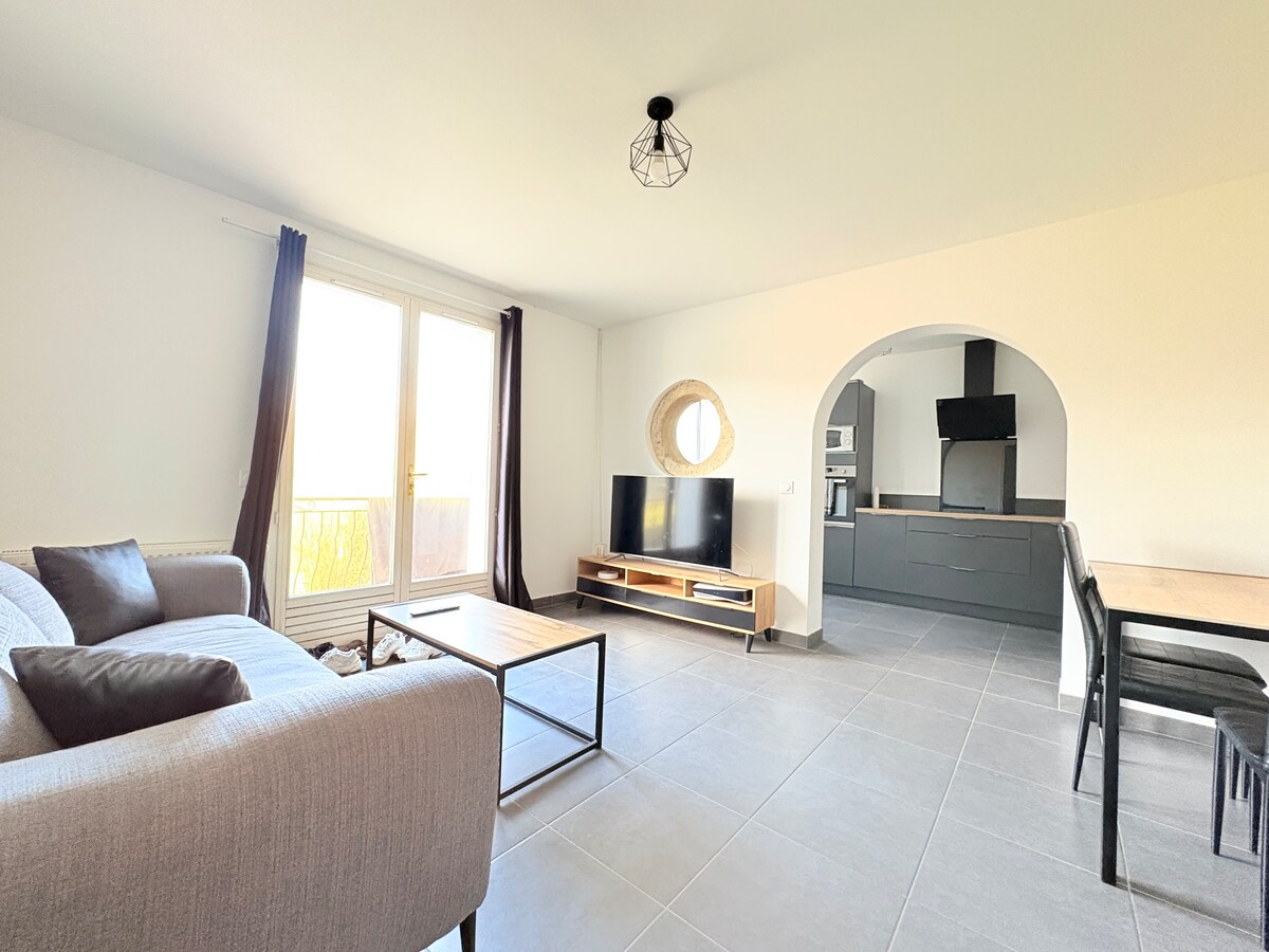 Brand new studio (rated 3*), in a recent and secure residence with free parking, in close proximity to a pleasant place to relax (shaded natural park), and halfway between the historic city center of Sens and the northern shopping area. Very bright apartment, well exposed, pleasant to stay in! Comfortable bedding, bed and bath linens provided. 120 cm HD TV, fiber optic, Netflix. Gentle inertia electric heating for optimal comfort!
