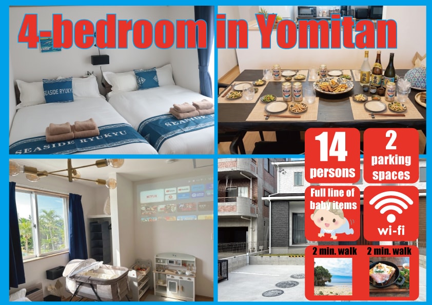 This spacious 150㎡ top-floor property offers an amazing panoramic sea view and accommodates over 16 guests. The layout includes 7 bedrooms and 4 bathrooms, arranged in three classic Japanese-style suites. ・美麗海景的房子,很乾淨,很舒服 ・16個人可以一起睡 ・45分開車到那霸機場 ・2分鐘近高速公路出口 ・5分鐘到24小時超級市場和餐館 ・10分鐘到海灘和水肺潛水 ・提供免費停車場&WIFI ・10 mins to beautiful Moon Beach ・45 mins to Naha airport by car ・5 mins to 24hour Lawson and nice restaurants. ・Free parking lot &WiFi ・16人を睡眠 ・那覇空港から車で50分 ・車1分でスーパーマーケット