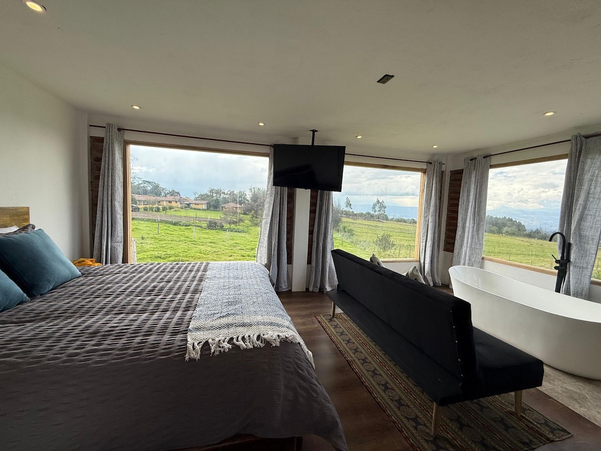 Glass Cabin in the Mountain located in the Ilaló Volcano within the Tumbaco Valley, 7 minutes from Ruta Viva, 20 minutes from Quito, 20 minutes from Quito Airport. It has 1 queen size bed, hot tub for 2 people, 2 living rooms, private bathroom, kitchen, minibar (refrigerator), dining room, grill area, shower with mountain and Tumbaco valley views. 1000 meters of gardens, 3000 meters of mountain trails. Firefly, butterfly, owl sightings