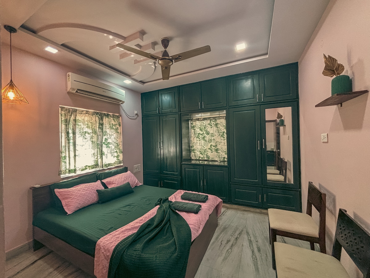 Luxurious, homely, secluded and only 5 mins from Hi-Tech City, this Full-Floor Apartment on the 2nd Floor is perfect for: - Family of 2-15 ppl, Wedding guests, NRI's etc, who need a centrally located home & daily maid service. - Remote working employees who need high-speed Wifi, a fully stocked kitchen & Inverter power back-up. - Couples who want a short term staycation & Chill in front of a 50" 4K-smartTV - Friends who need a private place to hangout in the city SELF-CHECK-IN using Smart Lock