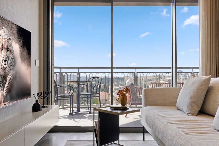 A sought-after studio in the heart of Jerusalem, on the 6th floor with an elevator, directly across from Mahane Yehuda Market. Cleverly divided into two spaces, it features a cozy living area, a fully equipped kitchen with a dining corner, and a comfy double bed. Thoughtfully designed, it balances style and function perfectly. Enjoy the lively atmosphere, easy access to public transportation, and all the city's top attractions just steps from your door. Perfect for a memorable stay in Jerusalem!