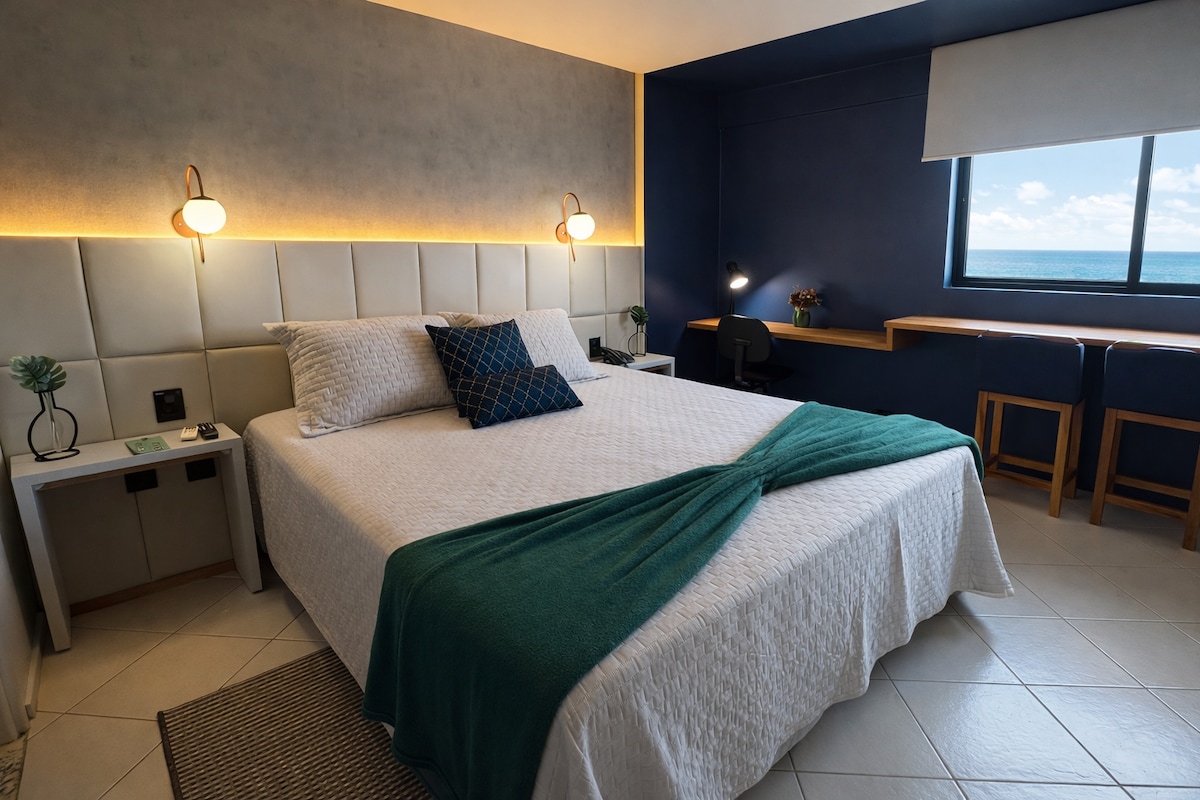 Beautiful Loft with space, comfort and all the facilities of a hotel. Our Loft has a large living room integrated with the suite, balcony with sea view, air conditioning, Smart TV, minibar, microwave, safe, desk, Wi-Fi and the best location in Ponta Negra. Close to bars, restaurants and the main tourist attraction of Ponta Negra, Morro do Careca. In addition to the privileged location, enjoy the complete facilities of a hotel with daily cleaning, room service, gym, swimming pool and sauna.