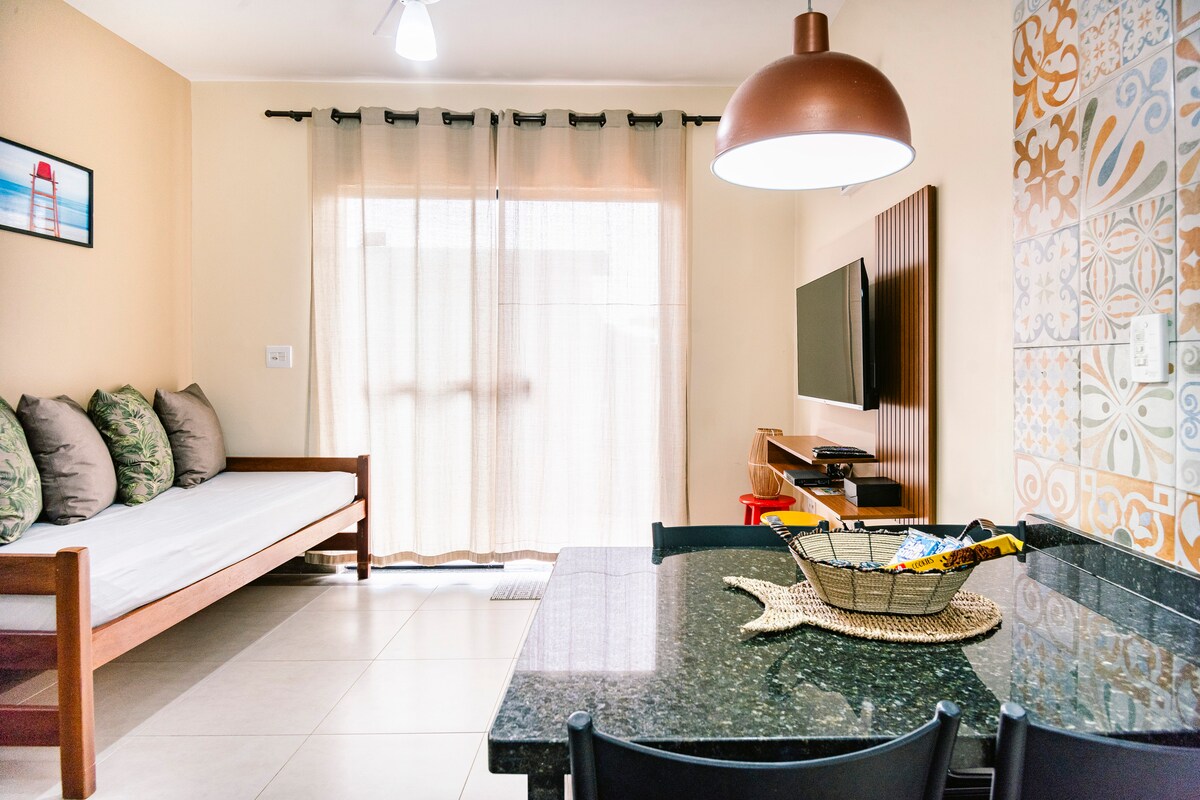 Cozy apartment in a condominium with 24-hour security, 200m from Lagoinha beach, overlooking the sea. With 2 bedrooms, Wi-Fi, Smart TV, living area with barbecue and hammock. Praia da Lagoinha is a peaceful environment, ideal for families. It has crystal clear water, suitable for nautical activities. In the left corner of the beach, a place for snorkeling and the starting point of the 7 Beaches Trail, where you will find paradisiacal places.