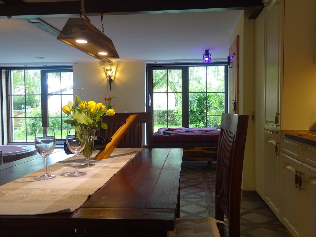 Our cottage in the countryside is a detached bungalow on a 900 square meter, beautiful garden plot on the outskirts of Leipzig. The property with a large garage (ping-pong table and punching bag), trampoline and slackline is at your disposal. The furnishings are open, bright and high quality and invite you to feel good and relax.