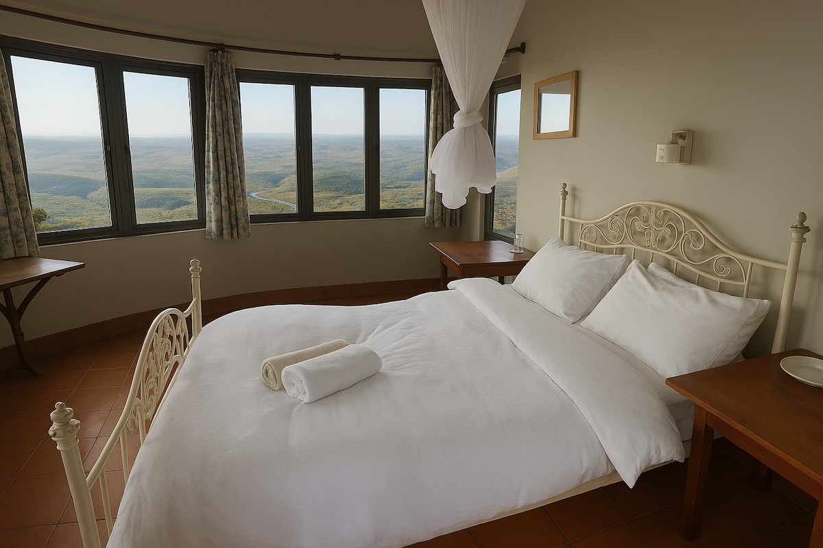 A clifftop hideaway in the Shimba Hills. A very private cottage offering complete seclusion and sweeping views. The bedroom has an amazing wrap-around, floor-to-ceiling window overlooking the Elephant Reserve 1,200 feet below with a comfortable king-size electric recliner bed. There is a separate well-equipped kitchen and dining area, and a private balcony with an outside dining area with a charcoal grill for Korean-style barbecues. Starlink Internet and competitive weekly and monthly rates.