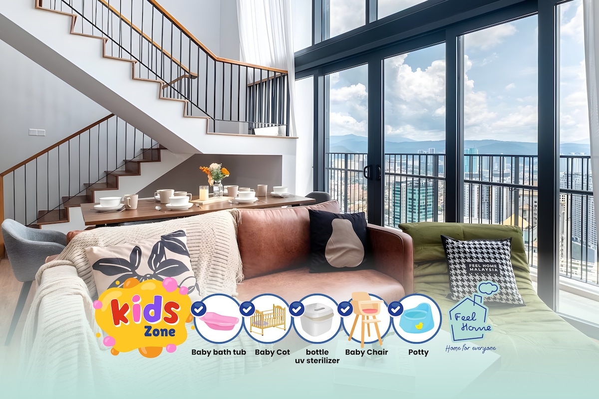 A cosy duplex on the highest floor of the building (Level 21), with a queen bed and a 3-seatersofa. Suitable for both short- and long-term stays. The building is in De Centrum Mall, with shops such as Super7 (supermarket), Tealive, Mr. DIY, SPP Bookstore and 7-Eleven among others, and facilities like launderettes and a clinic (Poliklinik MyMedik). •Check in time: from 3PM •Check out time: 12PM