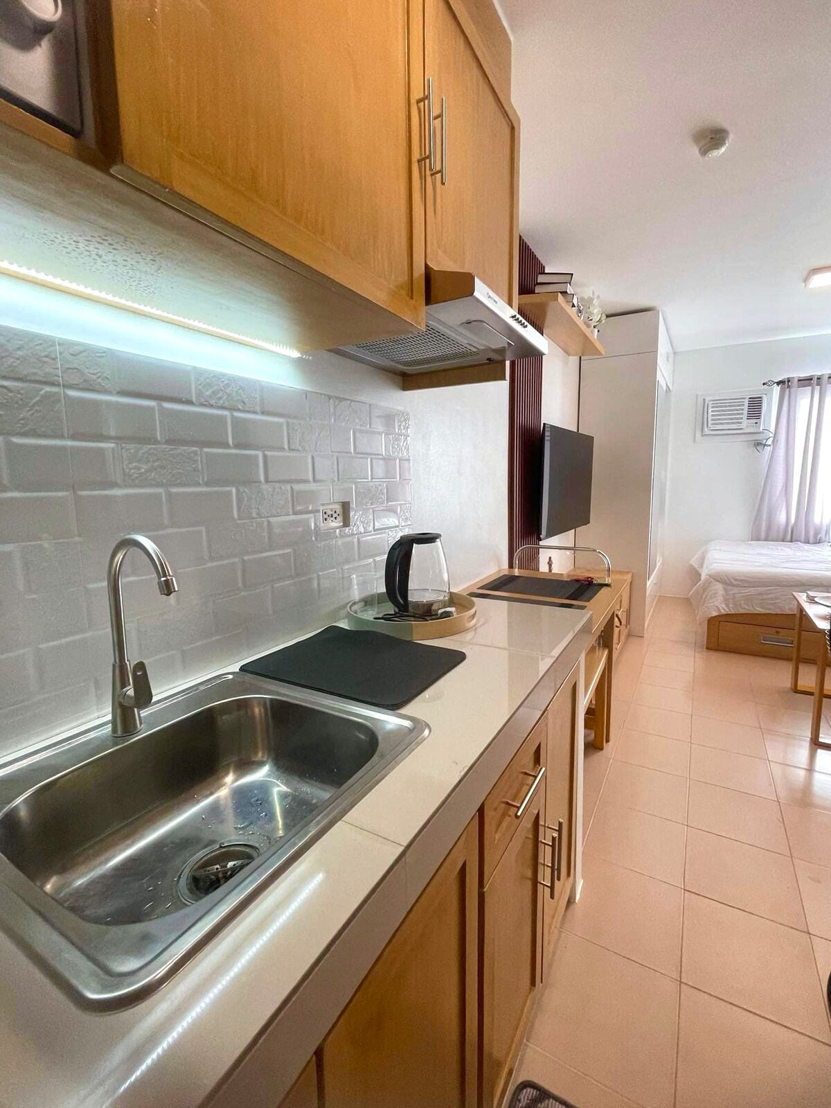 A studio condo unit at Marina Spatial, Dumaguete City—located near the iconic boulevard and Escaño Beach. It is at the heart of the city's lively dining scene and vibrant nightlife. This minimalist space with light interiors offers everything for a comfortable stay: a full bathroom, WiFi, TV, essential kitchen appliances and utensils, and cooking is allowed. Guests can also enjoy condo amenities including a swimming pool, gym, children’s playground, and an activity room with billiards and darts.