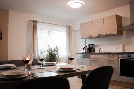 The quiet, bright, 104 m² apartment is located on the outskirts of town in the immediate vicinity of the forest. The property is located on the first floor in a former farmhouse with free parking in front of the house. Garage parking, as well as charging facilities for electric cars are possible on request. Children up to 12 stay free of charge. Pets by request. Due to increased cleaning effort per animal: small €5, large €8 to €10! Payable on site!