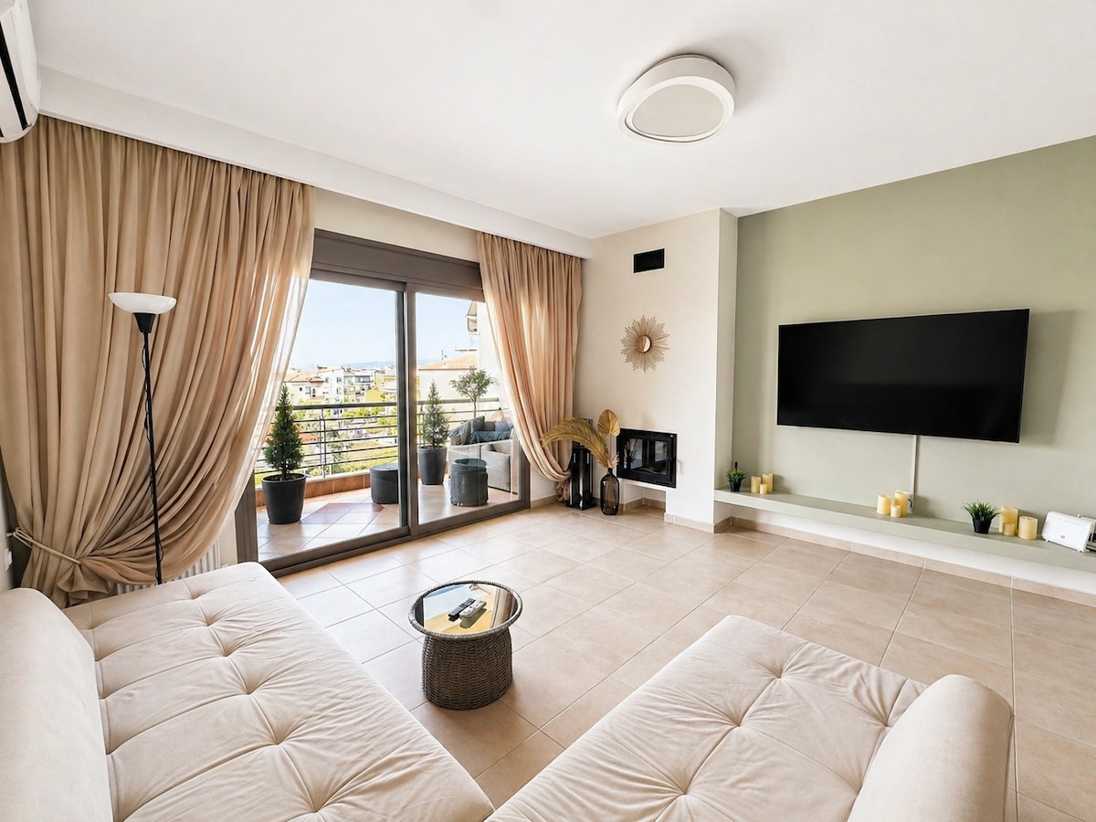 One of the best apartments with the highest reviews in Agia Triada. Parking: Yes! Blue Flag Beach: a 5 minutes walk! Restaurants: a 15 minutes walk! Two floors. Three balconies. One with seaview. One with view of the mountain. Recently renovated. Modern decor and artworks. Perfect for small families or couples. Max. four people. Airport: 15 minutes drive Fast Wi-Fi Air-conditioning Public transport (line 72). Smooth communication Personalized tips. Helpfull and respectful.