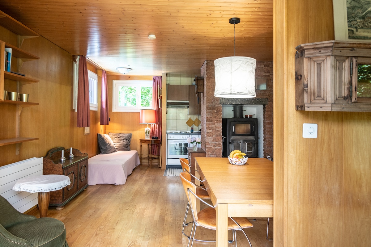 A full floor just for you, in a typical wooden chalet, on the 1st floor comprising: - 1 bedroom with double bed and desk - living room with sofa bed and TV / dining room with microwave, glasses, plates and cutlery, coffee machine, kettle and fridge (NO cooking) - balcony - toilet/shower - covered parking space - garden, grill area available located in the countryside, between the mountains, 10 minutes from Biel (by car or train, train station 5 min. walk)