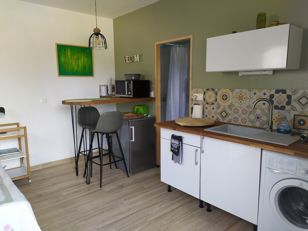 5 min from Narbonne, on Montredon des Corbières. Let yourself be lulled by the song of cicadas in this pretty 20 m² studio, with its private terrace. The host welcomes you to his home, but access is independent. The premises are entirely dedicated to you, 140 cm bed, air conditioning, TV, WIFI, equipped kitchen, shower room with toilet. Linen provided. You can park your vehicle in the cul-de-sac for free. Ideal for resting after a visit to the region, or work, or a day at the beach.