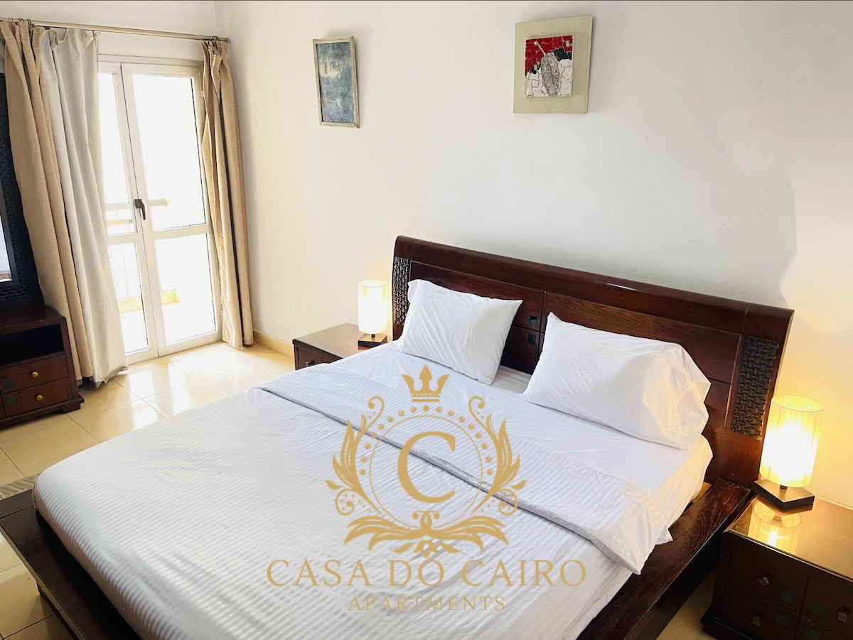 Large luxury 2 bedroom 3 bathroom apartment in the heart of New Cairo. In an upscale and safe neighborhood. In close proximity to New Cairo Downtown and 20 mins off Cairo Airport and 10 mins away from the AUC. Fully furnished and fully equipped Kitchen. 2 Large TVs (Bedroom and Living room) with Satellite TV. In house laundry. Relaxing roofed balcony to enjoy the warm weather. In house laundry. Complimentary Snacks and breakfast.
