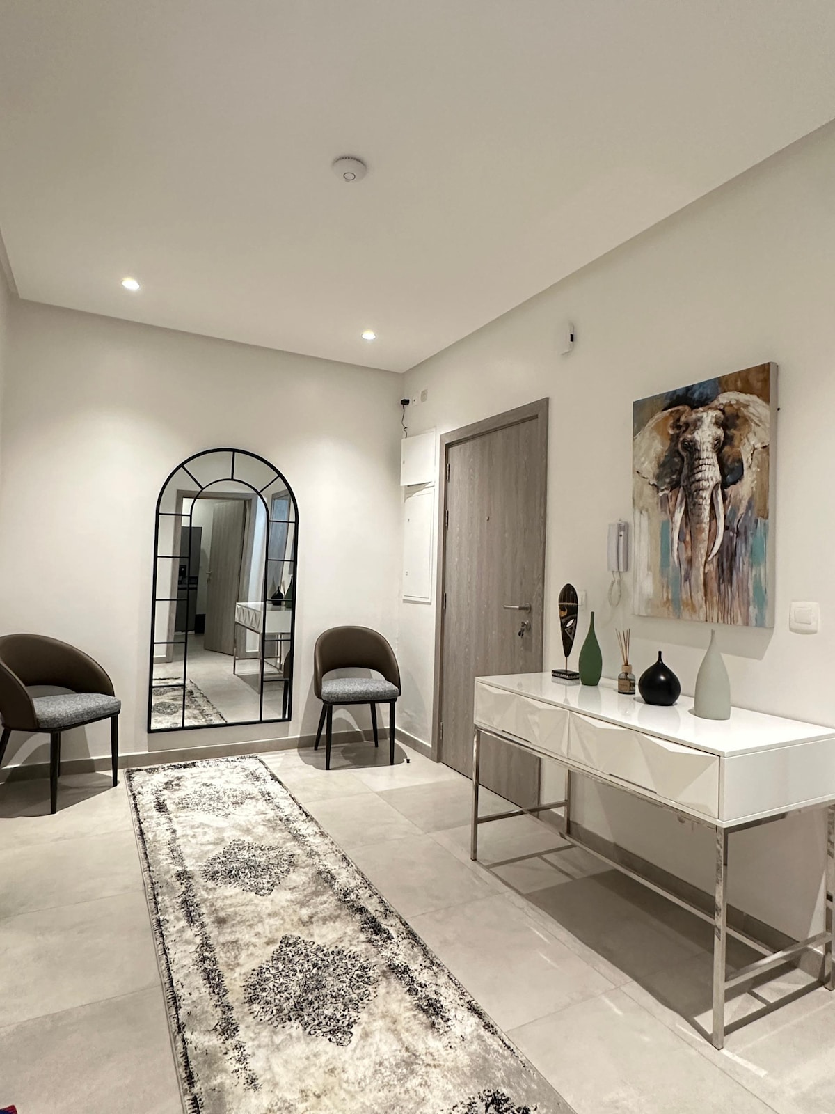 Détendez-vous dans ce logement calme et élégant proche de toutes commodités .Vous profiterez. •Salon confortable et magnifique avec une smart TV et la wifi •Cuisine américaine fonctionnelle équipée avec tous les accessoires nécessaires •Chambre équipée avec mini salon et salle de bain •Machine à laver de 7kg •Terrasse idéal pour une détente Appartement situé au 4ème étage (sans ascenseur ) dans un immeuble neuf calme et sécurisé (Gardiennage 24h24) dans un quartier idéal et accessible .