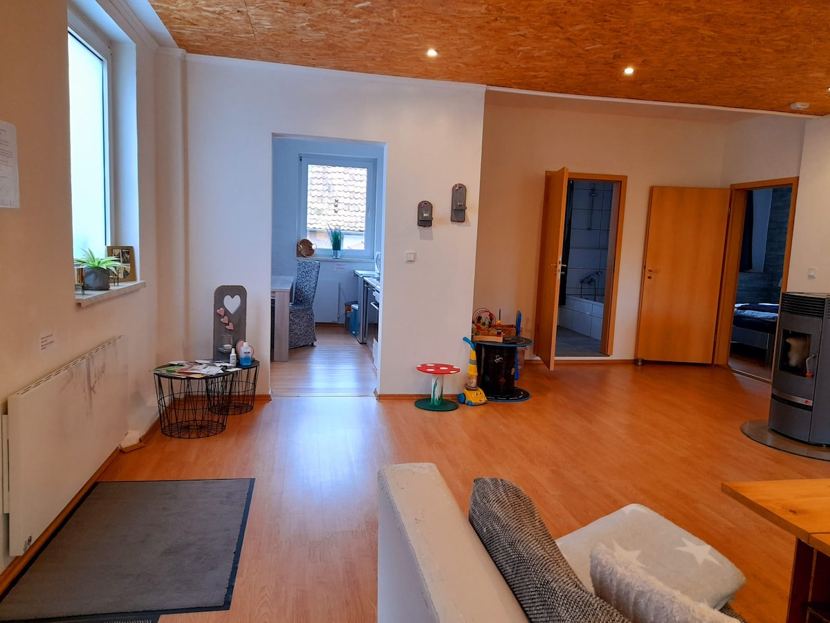 Our lovingly furnished apartment is located in the climatic health resort of Nieheim. In a quiet side street and yet central to shopping, the all-weather pool and the total of 130 km of hiking trails through the unique landscape, we invite you to linger. In the apartment, which is ideally suited for families, with a size of 75 square meters, a maximum of five people can stay at the same time. Non-commercial travelers over 14 years of age must pay a tourist tax of €1 per day.