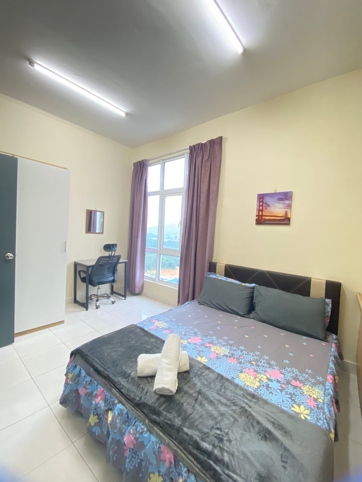 Explore our cozy studio, which can accommodate 2 to 3 people with a queen bed and a sofa bed. Only a 15-minute drive from KLIA T1/T2, the place is surrounded by many restaurants, fast food branches, groceries, and laundry shops, all within walking distance. Savor all the amenities, including the kids’ playground, BBQ area, gym, and swimming pool, with 24/7 security. * Unavailable drop your luggage before check in hours.Due to building designed, need to walk 10 steps staircase to get elevator.