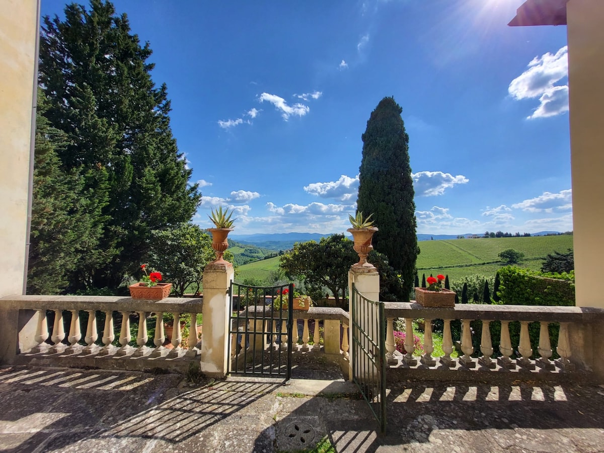 900 year old tower-penthouse apartment in Chianti Villa, spacious & super-scenic historical home that combines magical atmosphere with space, light, character, convenience. Painting-like 360° views of Tuscan Hills all the way to Florence; sun-filled, private grounds. Perfect location for an unforgettable family stay. Ample private property (including forest). Walking distance from village shops. Convenient location, Florence in sight.