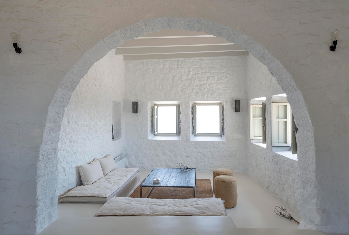 Sterna Residence, located in the medieval castle of Emporeios, is a traditional two-storey tower of the mid 17th Century. It collapsed, along with the rest castle after the devastating earthquake of 1933. Its restoration was completed in 2014 designed by Greg Haji Joannides and restored by architect Giorgos Tsironis. Restoring the authentic architecture of the building was achieved thanks to following the traditional building manner and using the genuine building materials.