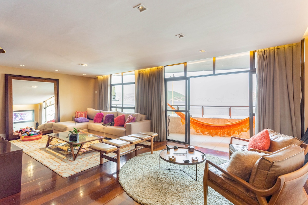 Excellent ground floor apartment, morning sun, all assembled and equipped, facing the huge infinity pool, in the best beachfront condominium in the oceanic region of Niterói, with private beach access. A true resort! It has 1 covered parking space (can be 2, to be arranged). Check-out, to be arranged beforehand, can be extended until the end of the day.