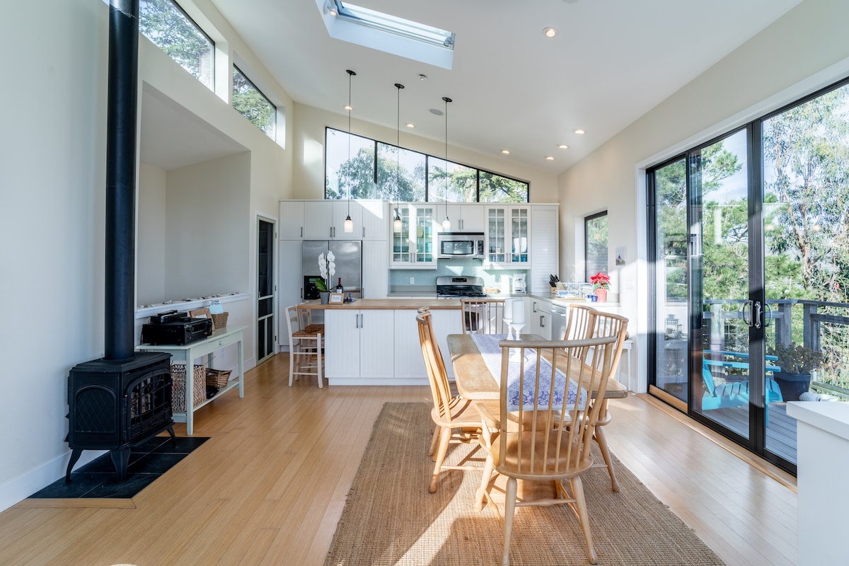 A blissful coastal retreat with unparalled ocean views, the Ocean Parkway House is nestled on a secluded bluff over looking the Pacific. This unique 1960's Bolinas beach house is a spot to truly relax and unwind. Fully updated with a curated mix of vintage and modern furnishings - our cottage has a mid-century design sensibility with luxuries like Coyuchi towels, a chef's kitchen, Scandinavian fireplace, outdoor rain shower, cedar hot tub, and new heated stone loveseat on the upstairs deck.