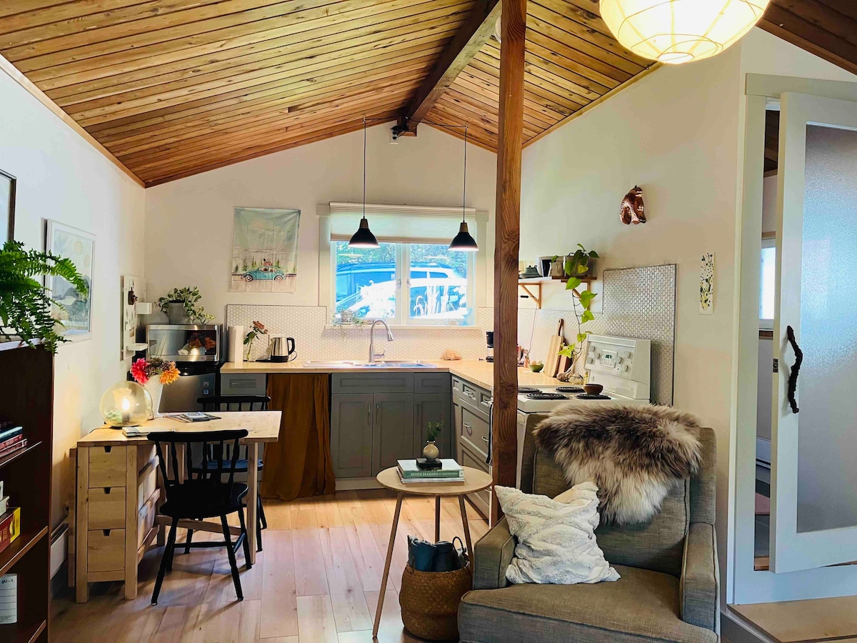 This clean, cozy cottage with a Scandi feel is located a short 7 minute walk from the best swimming and sunset beach on Salt Spring. Equipped with a kitchen, bathroom, and queen bed this is the perfect spot to enjoy a taste of the Salt Spring life. Shop at a local farm stand and use the kitchen to cook up a farm to table meal. Then go for a walk to the beach to enjoy the best sunset on Salt Spring! After a quick walk home, a comfy bed awaits, or stay up and play one of many board games offered!
