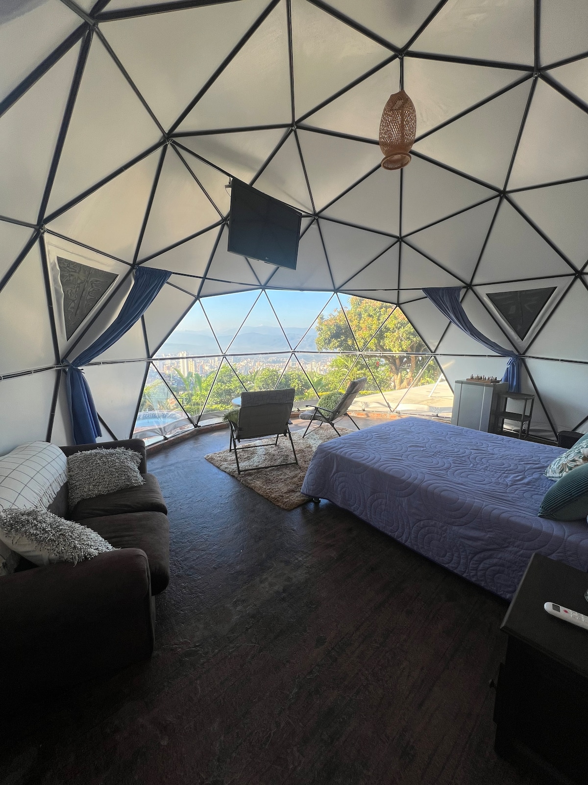 Paneo Glamping, the Bruma cabin has a capacity for two adults, the measurement is 35 m2, it has a catamaran mesh, bioethanol fire pit, Queen bed, hot water, minibar, air fryer, coffee maker. We include breakfast, and we have a vegan option if you prefer. You will have access to our natural creek within the property. We are located on a property with security, private parking, and access for any type of vehicle. We are just 20 minutes from Bucaramanga with a climate between 18°C and 26°C.