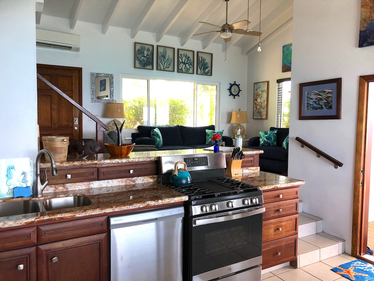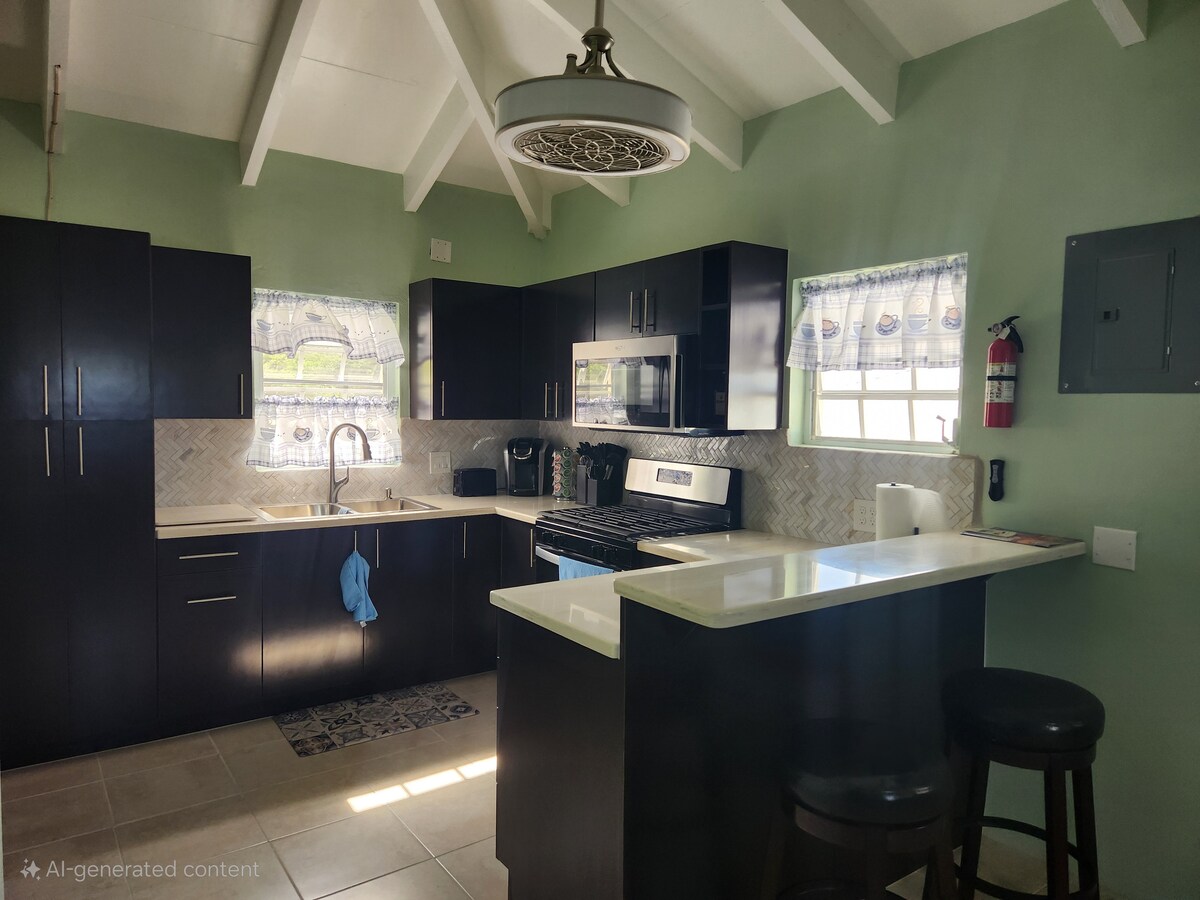 Peaceful secluded cottage fenced gated yard with fruit trees, mid Island close to shopping center, grocery stores and Hospital.Recently renovated. New AC, full kitchen, queen bed, all linens provided, beach chairs and towels. 15 minute drive to beach's. 10 minute drive to Airport, Christiansted Boardwalk, dining and shopping. 20 minute drive to Frederiksted, shopping and Rainbow Beach. Pavilion with grill, hammock, outdoor dining.Entire property on Tesla Solar System, back up power and generator