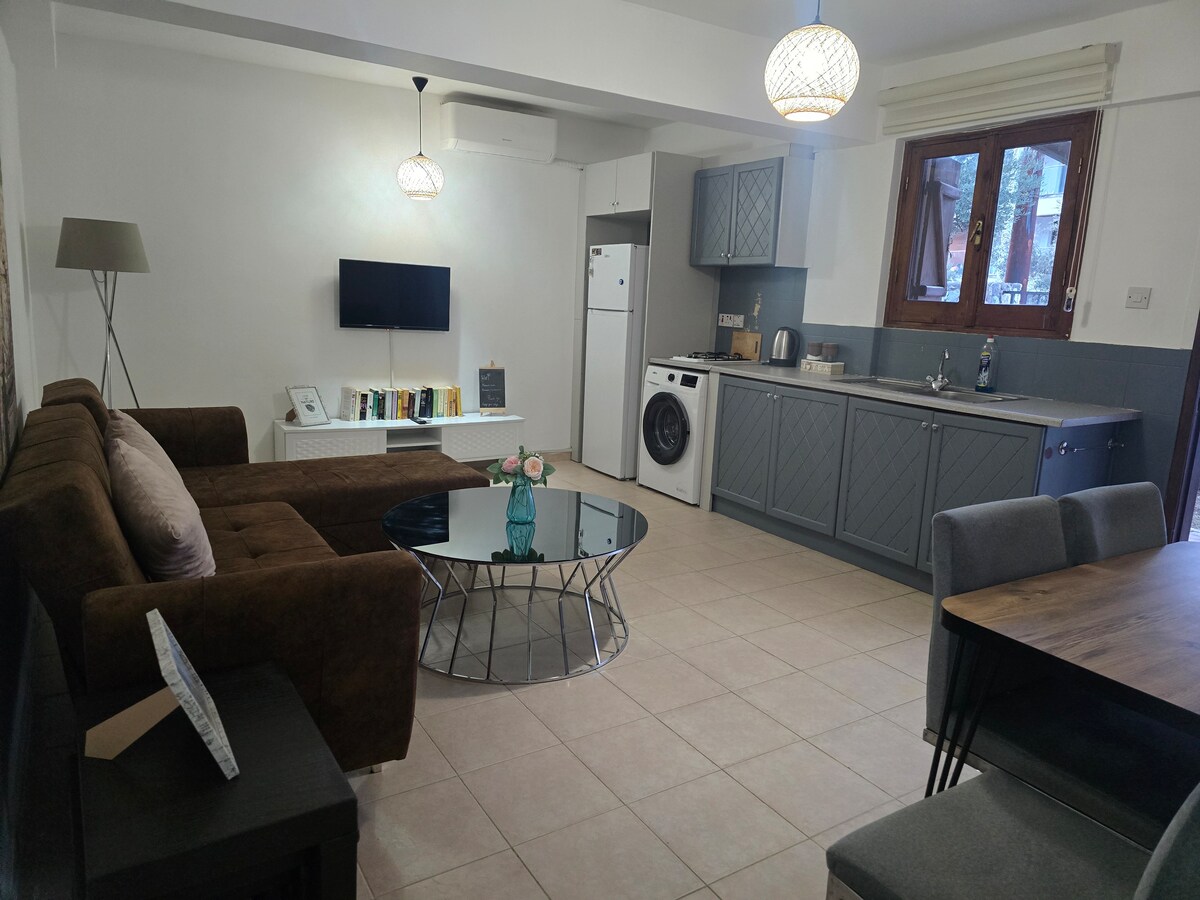 Unser modernes Haus in Ozanköy, Girne, liegt ruhig zwischen Olivenbäumen auf einem 1,5 Dönüm großen Grundstück, nur 3,5 km vom Stadtzentrum entfernt. Es verfügt über 1 Schlafzimmer, ein geräumiges Wohnzimmer, eine voll ausgestattete Küche, eine Dusche und 2 WCs. Platz für 2 Erwachsene und 2 Kinder (Schlafsofa oder Klappbett). Ideal für einen erholsamen Urlaub in der Natur, mit Blick auf Berge und Meer, in einem typischen zyprischen Dorf. Perfekt für Familien und Naturliebhaber.
