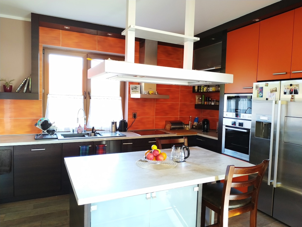 In our house, we offer our guests a haven of relaxation and tranquility, where you can break away from the hustle and bustle of the city and enjoy contact with nature. There is a huge forest and a lake in the immediate vicinity. We have attractions such as table tennis, a volleyball court, a boat, and bicycles. There is a barbecue on the terrace, and it is possible to light a fire. The cottage has a fireplace that provides a wonderful cozy character on cool autumn evenings. A refundable deposit is required