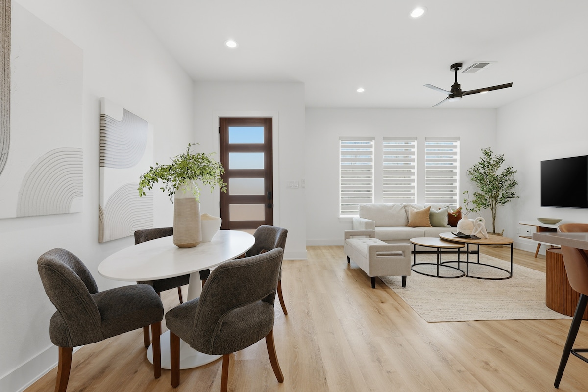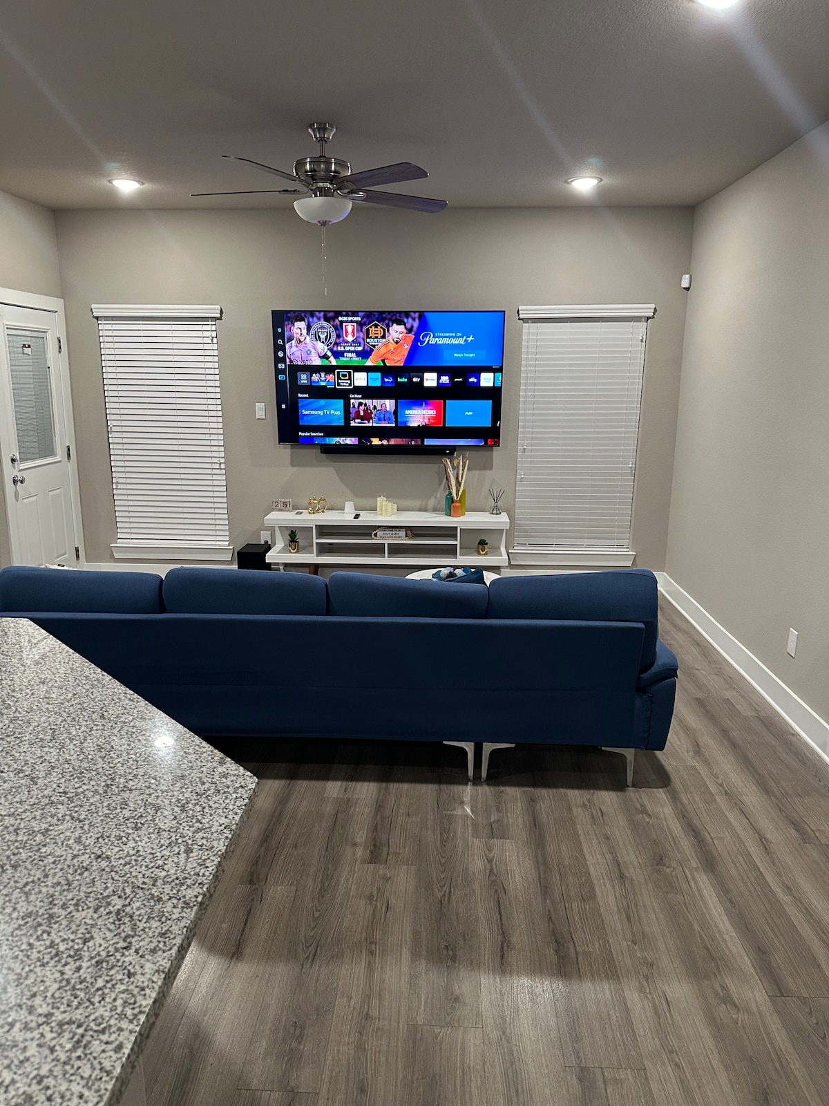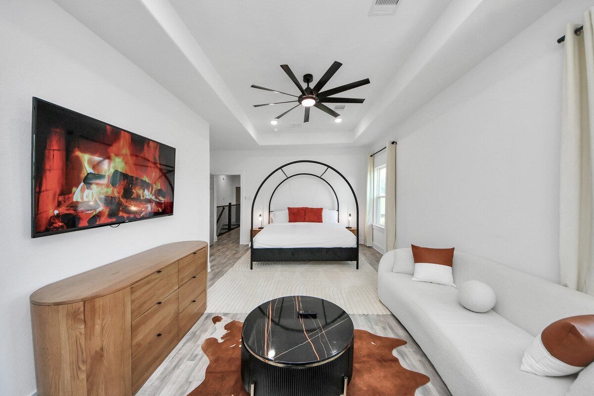 Experience luxury in this Houston townhouse with 3 bedrooms, each with a private bath/TV. The smart home has automated locks, lights, vacuums, and thermostats. The 2nd floor is an open-concept space with a kitchen, dining, and living area featuring an 85" Samsung TV, pool table, board games, and mini bar. There’s a small workstation in the downstairs bedroom and an office space with a full work setup. Enjoy the backyard seating area. Located under 5 miles from NRG Stadium and Minute Maid Park.