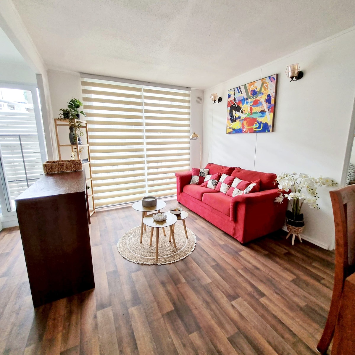 Disfruta de la comodidad de este tranquilo y céntrico departamento de 54 m2. a 50 metros de la plaza y parque de Chillán Viejo. Supermercado, farmacias, comercio, bencinera y fácil acceso. cuidamos el medio ambiente. El departamento funciona 100% con electricidad por lo cual no generamos contaminacion y queremos que su uso sea muy eficiente, cuenta 1 termo eléctrico para calentar agua, cocinilla eléctrica y microondas, además de tener ventanas termopanel y aislación térmica exterior.