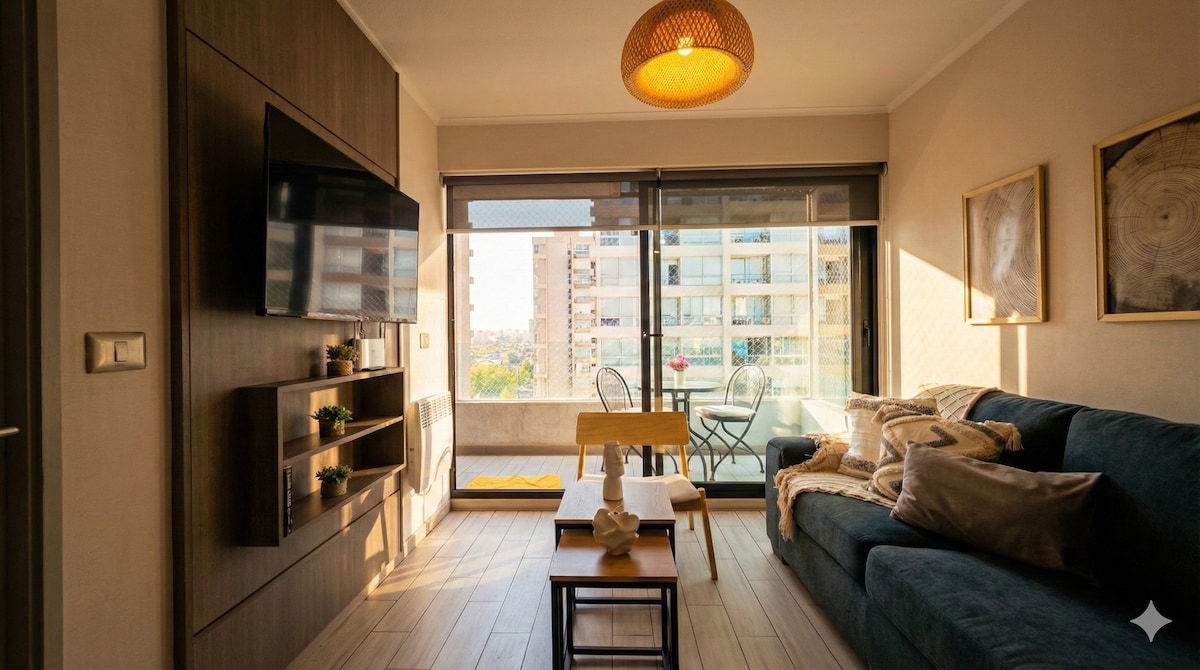 Enjoy the simplicity of this quiet and central accommodation. Enjoy a modern stay in a new building in the heart of Ñuñoa, next to Bustamante Park and steps from the Irarrázabal Metro. It has: 1 Bedroom with double bed and sofa bed. 2 Fully equipped kitchen with Nespresso coffee maker 3 Bathroom with tub and amenities. 4 Smart TV with Netflix. 5 600 Mbps flash WiFi. 6 Modern refrigerator. 7 Premium bedding. Smoking only on the terrace (Law 20.660).