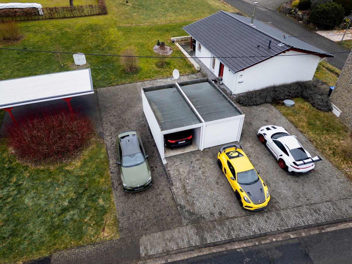 In a prime location at the Nürburgring - Welcome to the Racing Chalet! The Racing Chalet is a unique vacation home with up to 5 sleeping places and two garages. The racetrack and the town of Nürburg are a few minutes' walk away. The following highlights await you: - Fully equipped - 2 lockable individual garages - Carport and outdoor parking spaces - Kitchen & outdoor terrace with grill - Smart TV, table soccer and much more - Right at the Nürburgring - Various hiking and cycling trails
