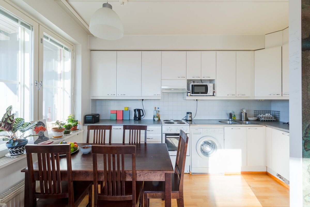 Stylish decor, a large glazed balcony, and flexible schedules: always early check-in (12:00 PM) and late check-out (6:00 PM). Good location in the heart of Tikkurila, close to the airport. Walking to the train station 10 minutes, with direct access to the airport (10 minutes) or the center of Helsinki (15 minutes). All the long-distance trains also stop at Tikkurila. Large grocery stores (Prisma, K-Supermarket / 200 m / open 6 AM – 12 AM) and plenty of restaurants nearby. A heated garage parking space is available for an additional fee.