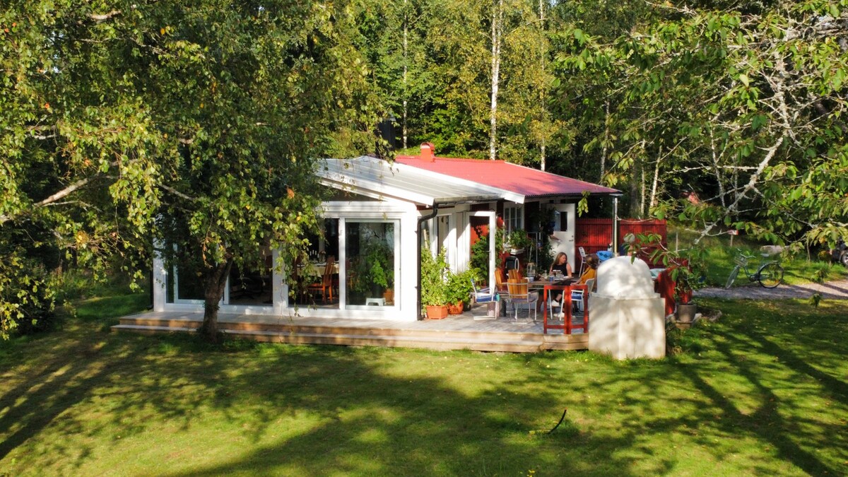 Amazing open-plan cottage, 90 sqm. Completely renovated 2022-24 with new modern bright kitchen, granite counters, dishwasher, induction stove with oven, microwave. Wooden floors in spruce and tiles in the winter insulated conservatory. New bathroom floor heating, washing machine. Sea plot with its own fishing waters included - with throwing rod or fishing rod. Wood-fired hot tub directly on the lake. Large lovely wooden decks, by the house as well as directly by the lake, with new garden furniture. Possibility to rent canoe and rowboat as well as free bicycles.